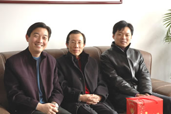 董事長楊揚(yáng)與副董事長兼縱橫國際董事長陳照東、縱橫國際總經(jīng)理凌衛(wèi)國在慰問時(shí)合影