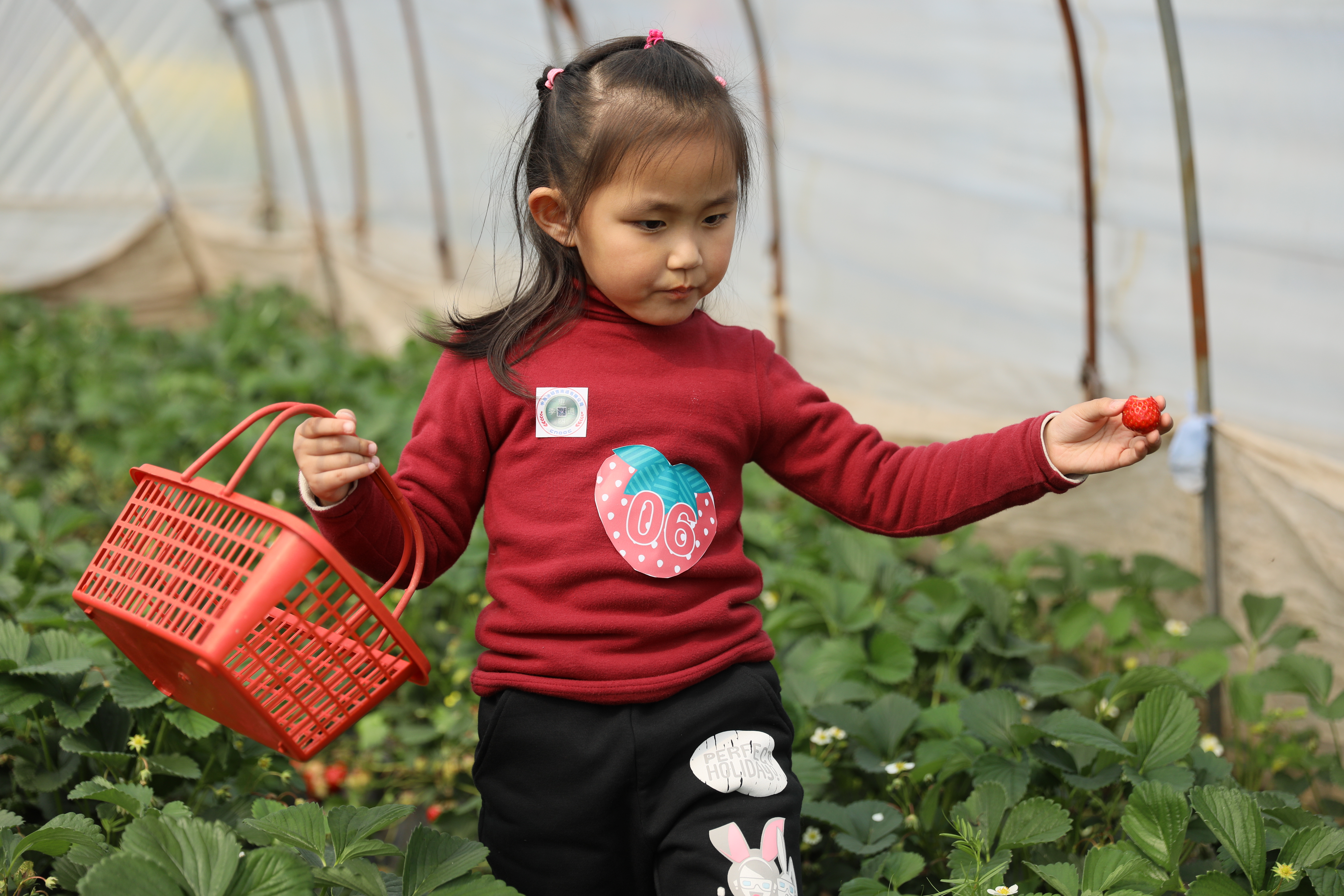 提著竹筐, 穿梭在一行行“草莓方陣”中,一顆顆鮮紅誘人的草莓點綴在大片碧翠的綠田上,彎腰摘下一顆放入嘴里,味蕾被濃香的漿液喂飽,滿口生香。