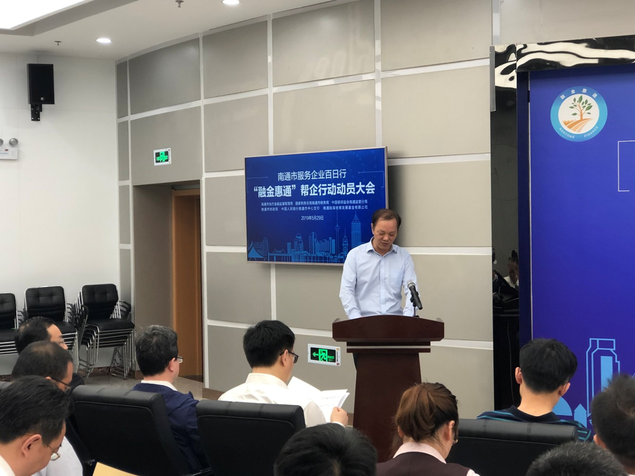 5月29日上午,南通市地方金融監(jiān)督管理局在市中小企業(yè)金融服務(wù)中心路演大廳召開(kāi)“融金惠通”幫企行動(dòng)動(dòng)員大會(huì)。大會(huì)由南通市地方金融監(jiān)督管理局局長(zhǎng)張乃華主持,南通市市委常委、常務(wù)副市長(zhǎng)單曉鳴出席大會(huì)并致辭,南通產(chǎn)業(yè)控股集團(tuán)有限公司副董事長(zhǎng)顧建國(guó)作為南通陸海統(tǒng)籌發(fā)展基金代表及“融金惠通”幫企行動(dòng)市直二分隊(duì)隊(duì)長(zhǎng)進(jìn)行了表態(tài)發(fā)言。