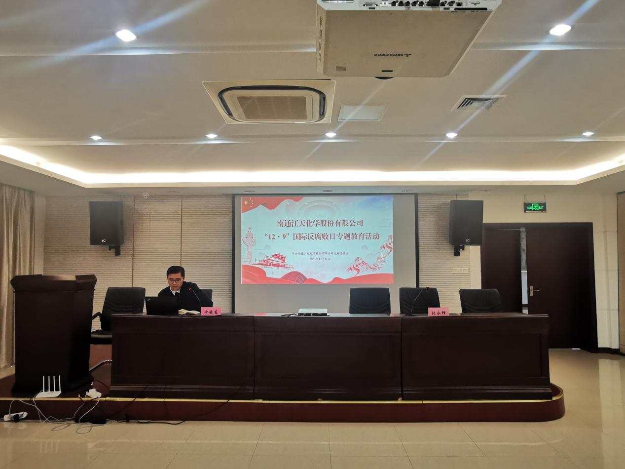 為持續(xù)筑牢公司廣大黨員干部群眾廉潔從業(yè)風(fēng)險底線意識,12月11日下午,南通江天化學(xué)股份有限公司黨支部組織召開“12·9”國際反腐敗日專題教育活動。會議由黨支部書記、副總經(jīng)理張永鋒主持,公司全體黨員、管理人員及相關(guān)部門人員參會。